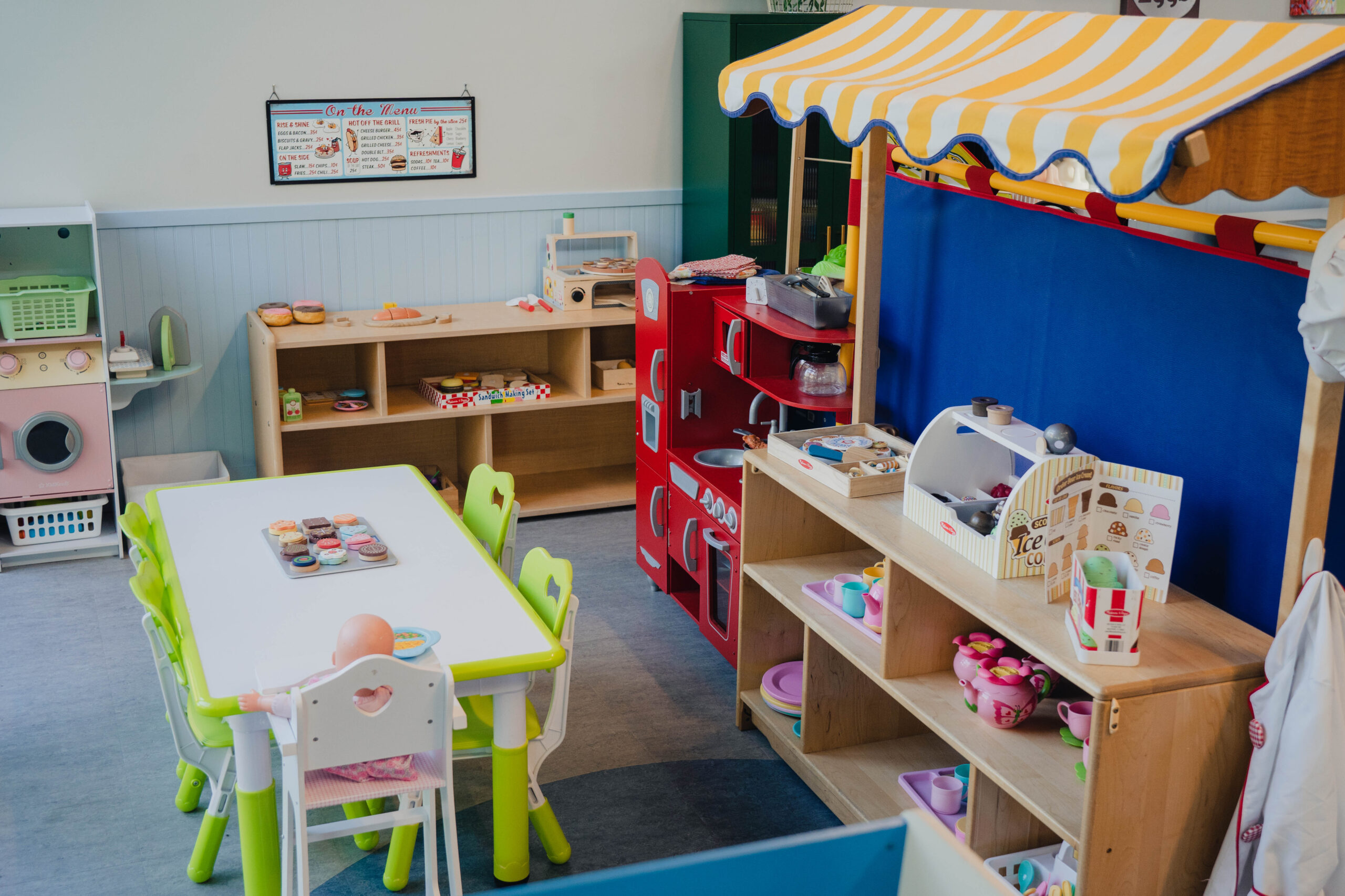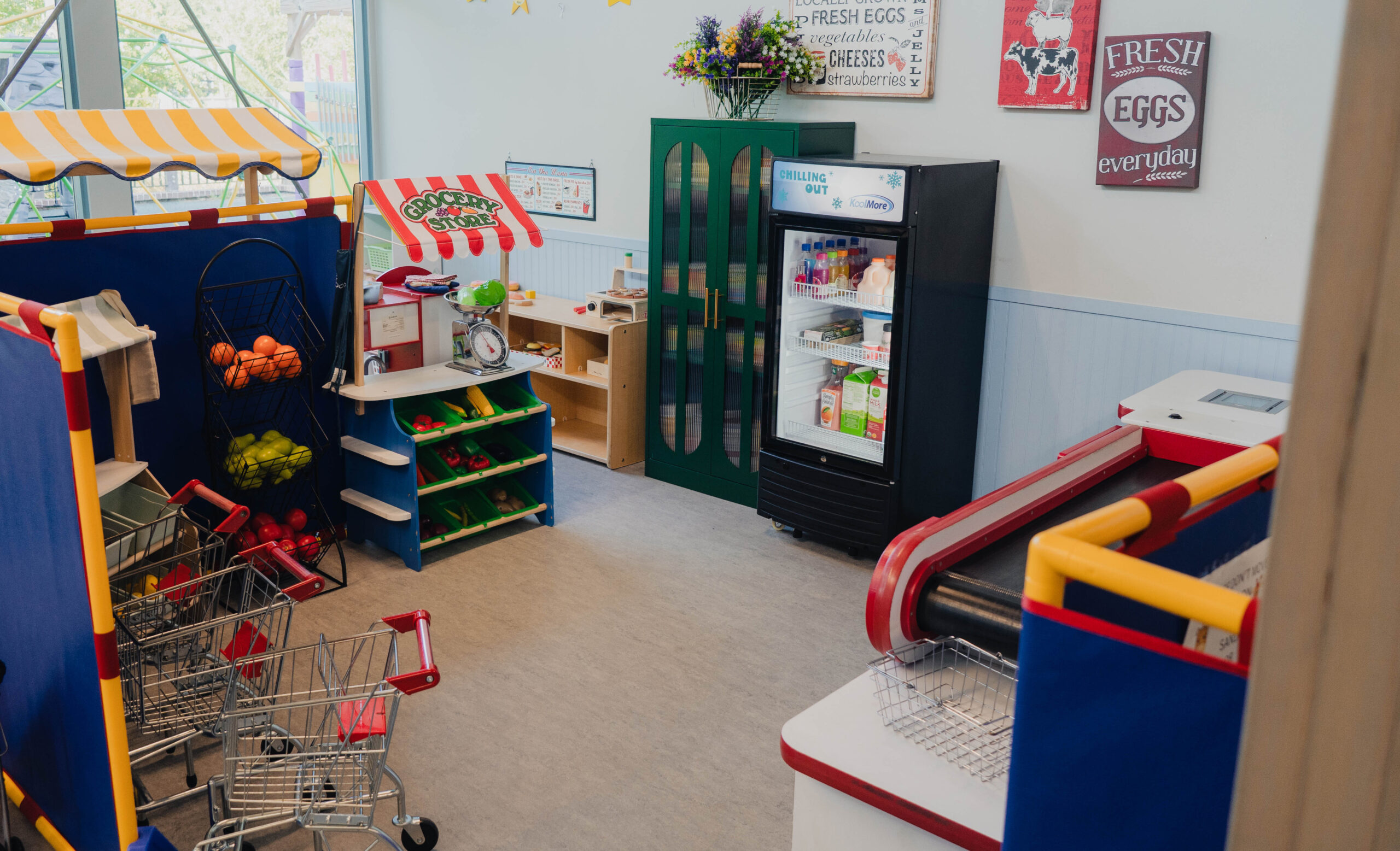 The Café experience exercises the imagination while providing opportunities for Math skills like sorting and making change, health with creating a balance meal, and social skills by providing opportunities for group interactive play. Children can create balanced meals and wait on customers as if working a real restaurant.