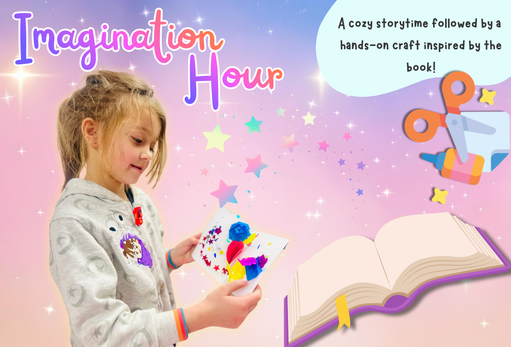 Imagination Hour is a weekly program featuring a staff-selected story paired with a creative arts-and-crafts activity. Designed to encourage meaningful one-on-one time, it gives parents and caregivers the chance to create, imagine, and connect alongside their children.